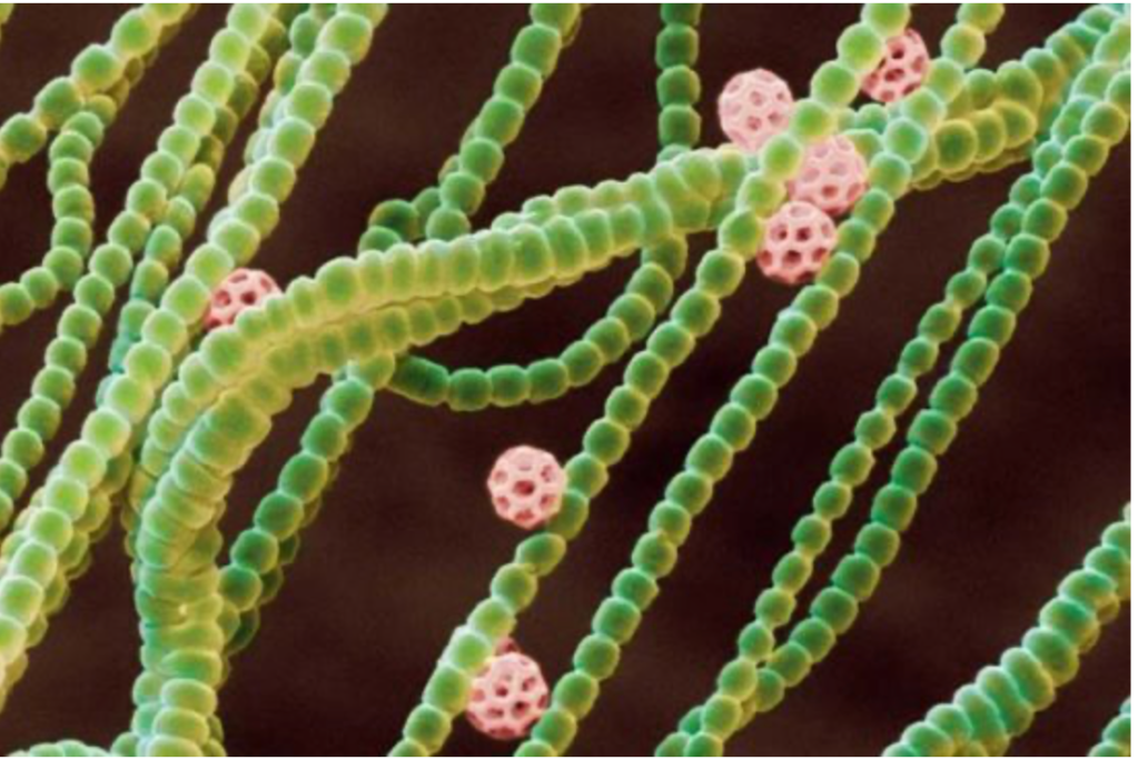 大気に含まれる窒素は、海洋の、身近なところでは、シアノバクテリア (藍藻)の一種であるネンジュ藻、また、表層の温度が比較的高く保たれている南シナ海などにおいては、やはりこれもシアノバクテリア の一種、ユレモの仲間でもあるトリコデスニウムなどの、まさにミクロの原核生物たちによって、還元され、食物連鎖の始まりであるアンモニア(NH3) が、ひたすら合成され続けています。(窒素固定)
