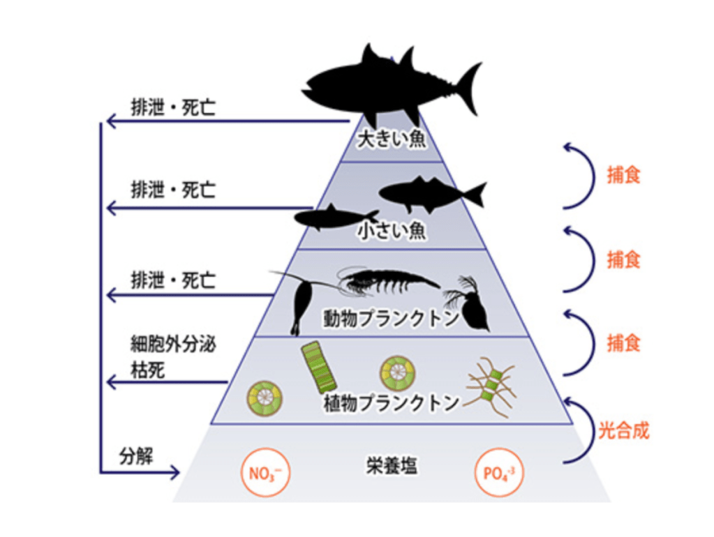 アンモニアは、海の水に溶けることにより、食べられるアンモニウムイオン(NH4) となり、それをまずは、おなじみの緑色した植物プランクトンたちが、同じように海に溶けている栄養分(リン・ケイ素など=栄養塩)とともに取り込みます。